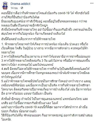เมื่อวันที่ 7 มีนาคม 2563 ทางเพจ Drama-addict ได้มีการโพสต์ข้อความระบุว่า…ตอนนี้มีข่าวลือว่ากินฟ้าทะลายโจรแล้วป้องกัน covid-19 ได้ จริงๆยังไม่มีงานวิจัยที่ยืนยันว่าป้องกันได้นะ มีของอภัยภูเบศน์เขากำลังวิจัยอยู่ ตอนนี้อยู่ในขั้นหลอดทดลอง กว่าจะทดลองในสัตว์ในคนน่าจะอีกพักใหญ่ ดังนั้นใครจะกินฟ้าทะลายโจร อย่าไปซื้อมากินเองกันมั่วซั่ว เพราะแม้จะเป็นสมุนไพร หากกินไม่ถูกต้อง ก็อาจเกิดผลข้างเคียงได้