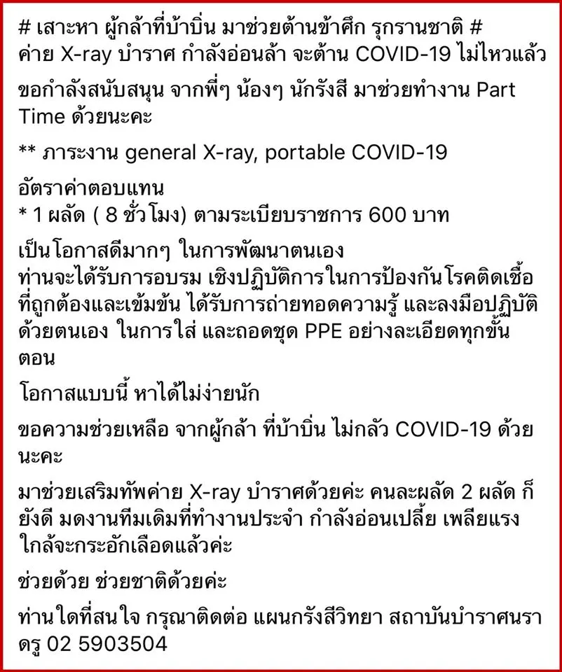 เพจ หมอแล็บ แพนด้า ได้โพสต์ข้อความ ประกาศตามหานักรังสีเทคนิค ไปช่วยงานสถาบันบำราศนราดูร ระบุว่า การแพร่ระบาดของเชื้อไวรัสโควิด ทำให้นักรังสีเทคนิค ของสถาบันทำงานอย่างหนักจนแทบไม่มีเวลาพักผ่อน ร่างกายอ่อนล้า จึงขอกำลังเสริมจากพี่ๆน้องๆ นักรังสี มาช่วยทำงาน Part Time อัตราค่าตอบแทน 1 ผลัด หรือ 8 ชั่วโมง ตามระเบียบราชการ 600 บาท