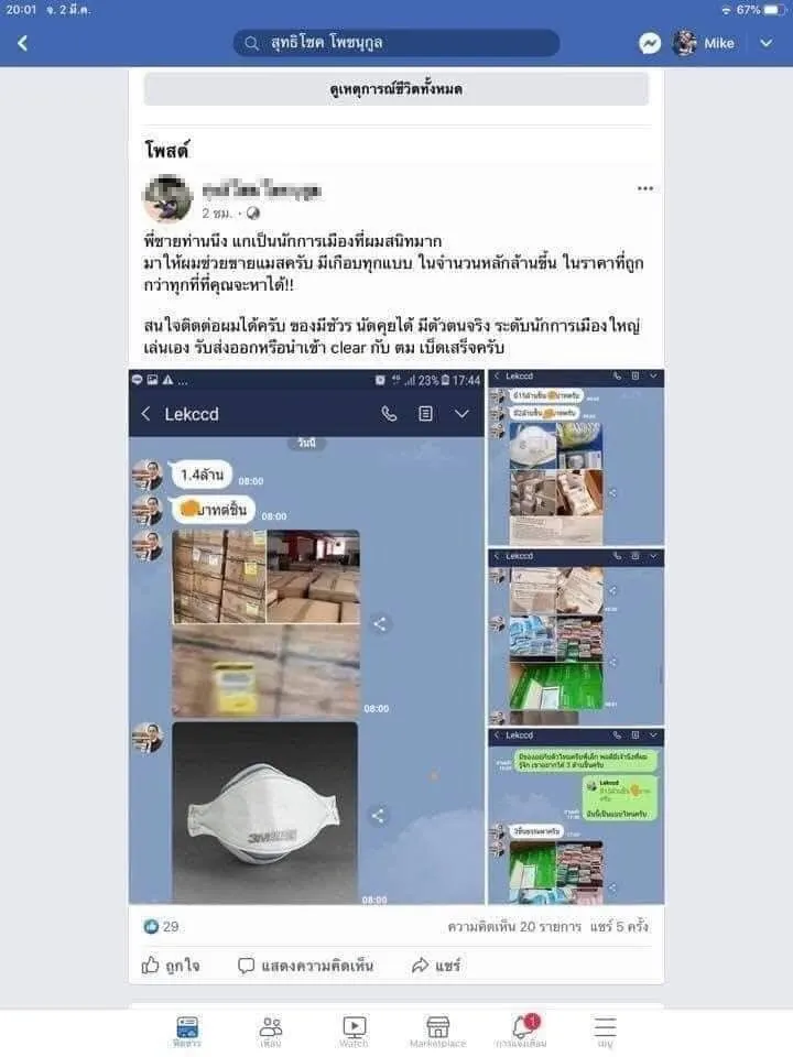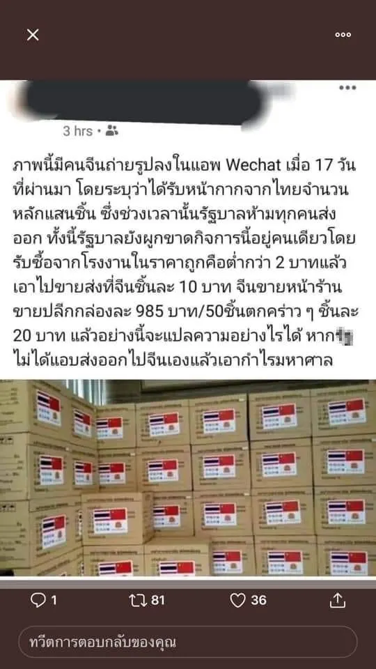 ด่วน! เพจดังแฉคนกักตุนหน้ากากอนามัยกว่า 200 ล้านชิ้น ให้นายทุนจีน