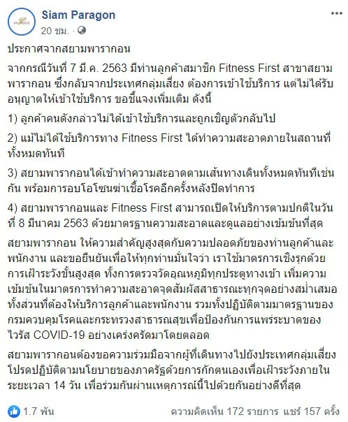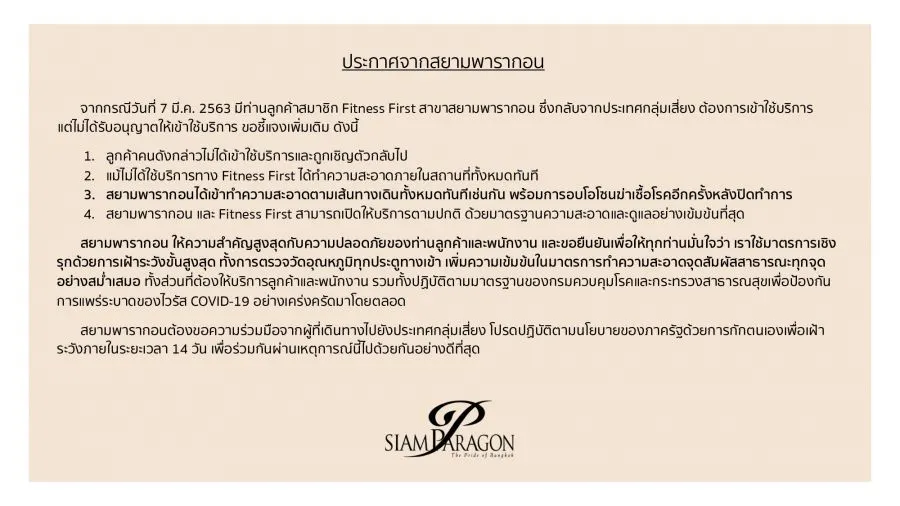 จากกรณีเมื่อวันที่ 7 มีนาคม 2563 ที่ผ่านมา ทางสยามพารากอน ได้ออกมาชี้แจง มีท่านสมาชิกท่านหนึ่งที่เข้ามาใช้บริการ Fitness First ซึ่งกลับจากประเทศกลุ่มเสี่ยง ต้องการเข้าใช้บริการ แต่ไม่ได้รับอนุญาติให้เข้าใช้บริการ ขอชี้แจ้งเพิ่มเติ่มดังนี้
