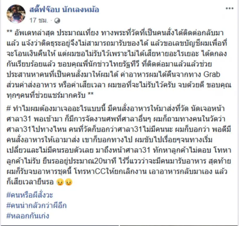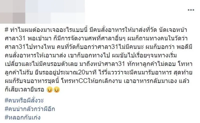 หนุ่มแกร็บโพสต์ คนนัดให้เอาอาหารมาส่งให้ที่วัดศาลา 31