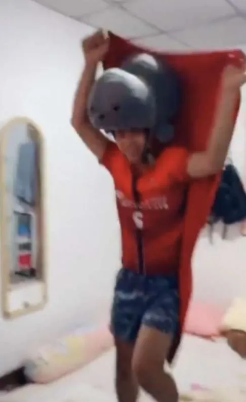 ภาพที่เห็นทำเอาทึ่ง เพราะแฟนหนุ่มของเธอกำลังเล่นเชิดสิงโตอยู่คนเดียวในห้อง
