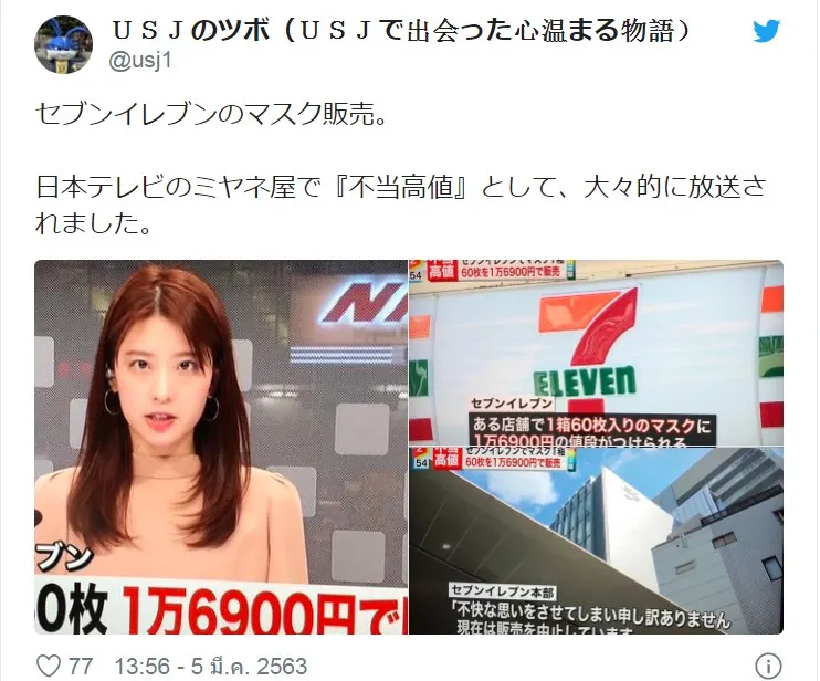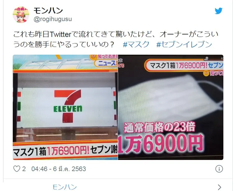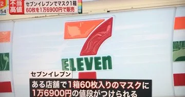 มีผู้ใช้ทวิตเตอร์ชาวญี่ปุ่นชื่อ @planet_plastic ได้โพสต์ภาพราคาขายหน้ากากอนามัยในร้านสะดวกซื้อเซเว่นสาขาหนึ่ง ที่ติดป้ายราคาขายหน้ากากอนามัยชนิดแพงสุดๆโดยเผยว่าหน้ากากอนามัยขายแบบกล่อง 60 ชิ้น ราคา 16,900 เยน (ราว 5,000 บาท) ยังไม่รวมภาษี ทั้งที่ปกติแล้วราคาจริงจะตกอยู่ที่กล่องละ 600 เยน (ราว 180 บาท) เท่านั้น ซึ่งแพงขึ้นหลายเท่าตัวด้วยสาเหตุใดก็มิทราบได้