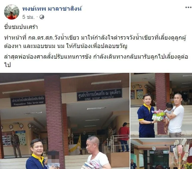 จากกรณีโลกออนไลน์มีการแชร์ภาพของนายตำรวจท่านหนึ่งที่นั่งเลี้ยงลูกของผู้ต้องหาอยู่ภายใน สภ.วังน้ำเขียว อย่างเอ็นดูจนกลาย เป็นเหตุการณ์น่าชื่นชมปนเศร้า