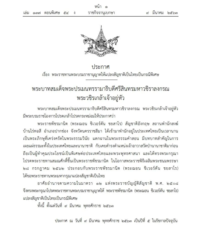 อาศัยอำนาจตามความในมาตรา ๑๒ แห่งพระราชบัญญัติสัญชาติ พ.ศ. ๒๕๐๘ จึงทรงพระกรุณาโปรดพระราชทานพระบรมราชานุญาตให้ พระราชพัชรมานิต (พระฌอน ชิเวอร์ตัน ชยสาโร) แปลงสัญชาติเป็นไทยเป็นกรณีพิเศษ