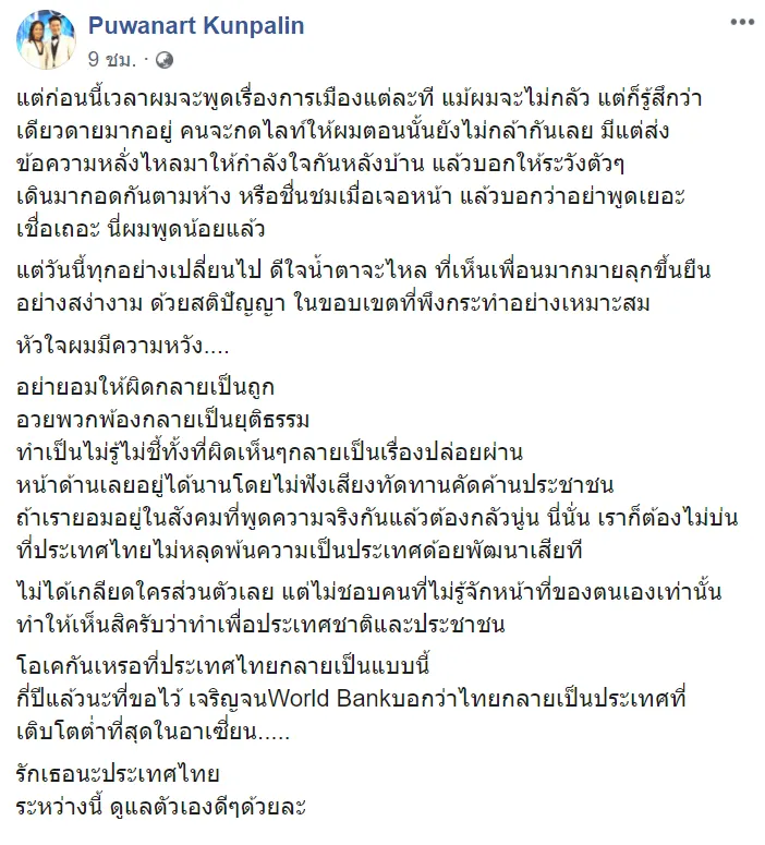 แต่ก่อนนี้เวลาผมจะพูดเรื่องการเมืองแต่ละที แม้ผมจะไม่กลัว แต่ก็รู้สึกว่าเดียวดายมากอยู่ คนจะกดไลท์ให้ผมตอนนั้นยังไม่กล้ากันเลย มีแต่ส่งข้อความหลั่งไหลมาให้กำลังใจกันหลังบ้าน แล้วบอกให้ระวังตัวๆ