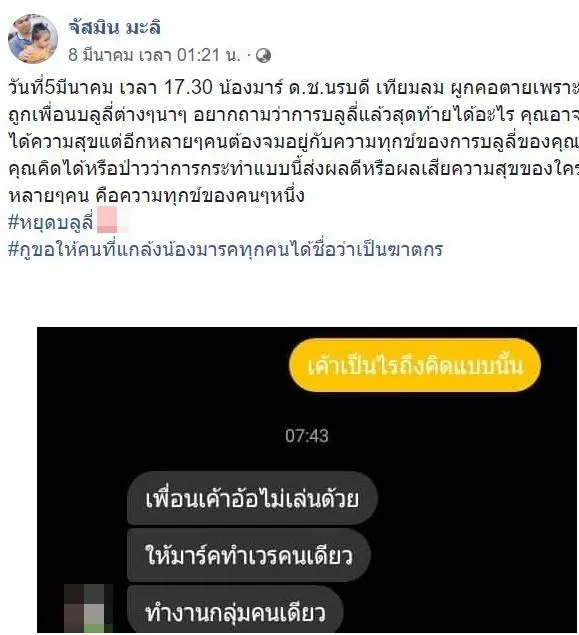 สลด ข้อความสุดท้ายน้องมาร์ค สุดทนโดนเพื่อนแกล้ง ผูกคอดับ