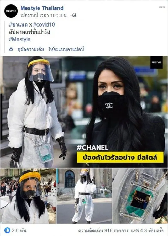 เรียกได้ว่า ผู้หญิงกับแฟชั่นเป็นของคู่กัน อย่างล่าสุดประชาชนต่างตื่นตระหนกเกี่ยวกับ COVID ต่างก็หาหน้ากากอนามัยและชุดป้องกันมาใส่เพื่อความปลอดภัย จึงทำให้ทางผู้นำแฟชั่นของผู้หญิงทั่วโลก อย่าง ชาแนล ได้ออกแบบสินค้าตัวใหม่ อย่างเช่น หน้ากากอนามัย ชุดคลุมป้องกัน COVID และหมวกใสป้องกันด้านหน้า โดยทางเพจ Mestyle Thailand ได้โพสต์ภาพพร้อมข้อความใจความว่า