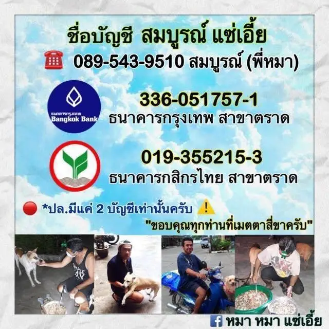 โดยสมบูรณ์ แซ่เอี้ย ประกอบอาชีพนวดแผนโบราณหาเลี้ยงสุนัขและแมวมา 10 ปี จากเดิมที่เคยมีรายได้วันละ 700 บาท แต่เนื่องจากปัจจุบันต้องค่อยช่วยเหลือบีบฉี่ให้กับสุนัขป่วยจึงมีรายได้ลดลงไม่เพียงพอต่อค่าใช้จ่ายทั้งข้าวสารวันละ 1 ถัง อาหารเม็ดวันละ 2 กระสอบ โครงไก่บดวันละ 10 กิโล ตับไก่ชำรุดวันละ 5 กิโล ไข่ไก่ รวมทั้งค่าน้ำเกลือ ค่ารักษา ค่ายารักษาโรคสำหรับสุนัขป่วย ค่าวัคซีน และค่าทำหมัน หากใครอยากบริจาคเพื่อช่วยเหลือสุนัขและแมว สามารถบริจาคเข้าบัญชี นายสมบูรณ์ แซ่เอี้ย 336-051757-1ธ.กรุงเทพ สาขาตราด และ019-355215-3 ธ.กสิกรไทย สาขาตราด เบอร์โทร 089-543-9510