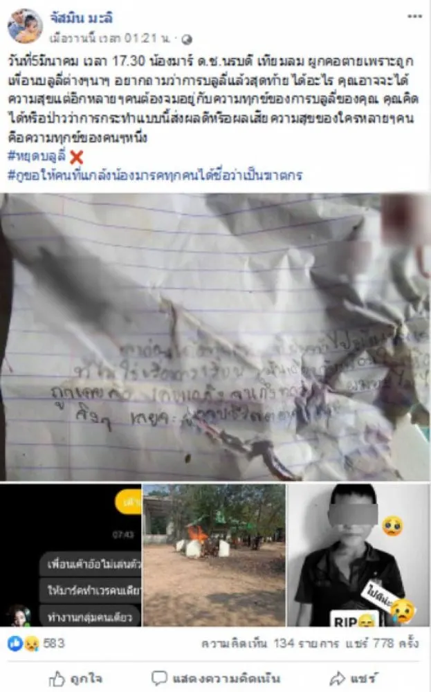 จากรณีมีผู้ใช้เฟสบุ๊คชื่อ จัสมิน มะลิ ได้ออกมาโพสต์ภาพ ผ่านเฟสบุ๊คส่วนตัวโดยได้ระบุข้อความว่า วันที่ 5 มีนาคม เวลา 17 30 น้องมาร์ ดช นรบดี เทียมลม ผูกคอดับเพราะถูกเพื่อนบลูลี่ต่างๆนาๆ อยากถามว่าการบลูลี่แล้วสุดท้ายได้อะไร คุณอาจจะได้ความสุขแต่อีกหลายๆคนต้องจมอยู่กับความทุกข์ของการบลูลี่ของคุณ คุณคิดได้หรือป่าวว่าการกระทำแบบนี้ส่งผลดีหรือผลเสียความสุขของใครหลายๆคน คือความทุกข์ของคนๆหนึ่ง