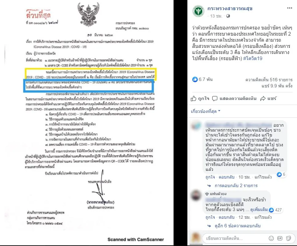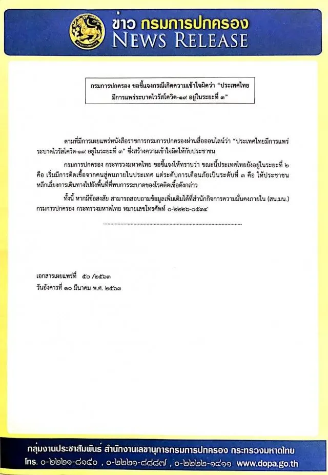 กรณีที่มีเอกสารจากกรมการปกครองระบุว่า สถานการณ์การแพร่ระบาดของไวรัสโคโรน่า 2019 หรือ COVID-19 ในประเทศไทย อยู่ในระยะที่ 2 แต่ได้ยกระดับการแจ้งเตือนเป็นระดับที่ 3 สร้างความสับสนให้กับประชาชน