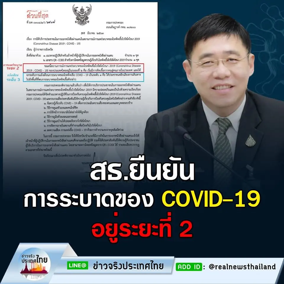 🔺🔺 กรณีที่มีเอกสารจากกรมการปกครองระบุว่า สถานการณ์การแพร่ระบาดของไวรัสโคโรน่า 2019 หรือ COVID-19 ในประเทศไทย อยู่ในระยะที่ 2 แต่ได้ยกระดับการแจ้งเตือนเป็นระดับที่ 3 สร้างความสับสนให้กับประชาชน