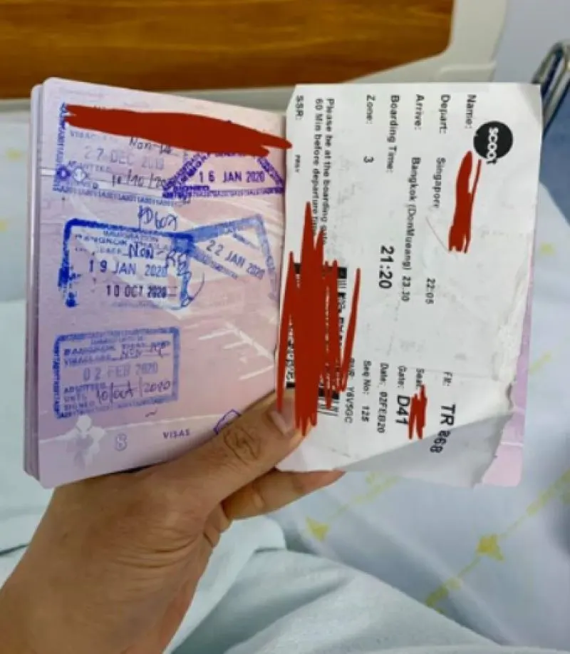 พร้อมกันนี้ได้โพสต์ภาพหนังสือเดินทางและตั๋วเครื่องบินสายการบินสกู๊ต ที่มีการเดินทางจากสิงคโปร์มายังสนามบินดอนเมือง ประเทศไทย เมื่อวันที่ 2 กุมภาพันธ์ ซึ่งเกินจากระยะเวลากักตัวเพื่อดูอาการ 14 วันแล้ว โดยคาดว่าอาจจะติดจากในกรุงเทพฯ