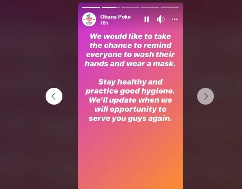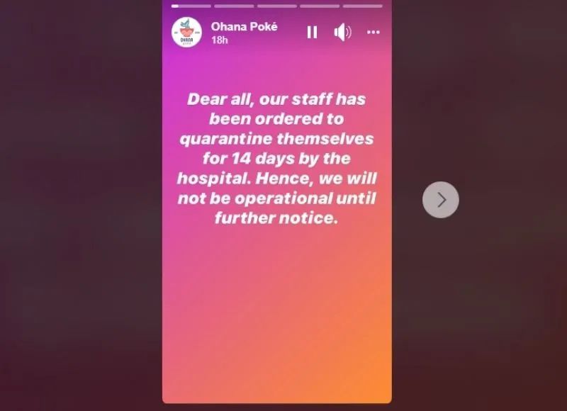 ล่าสุด ทางร้าน Ohana Poke ได้ออกมาอัปเดตผ่านเฟซบุ๊กสตอรี่ ว่า ในตอนนี้ ทางร้านได้ดำเนินมาตรการให้พนักงานกักตัวเองเป็นเวลา 14 ดังนั้น ในช่วงเวลานี้ ทางร้านจึงจำเป็นต้องปิดร้านเป็นการชั่วคราว