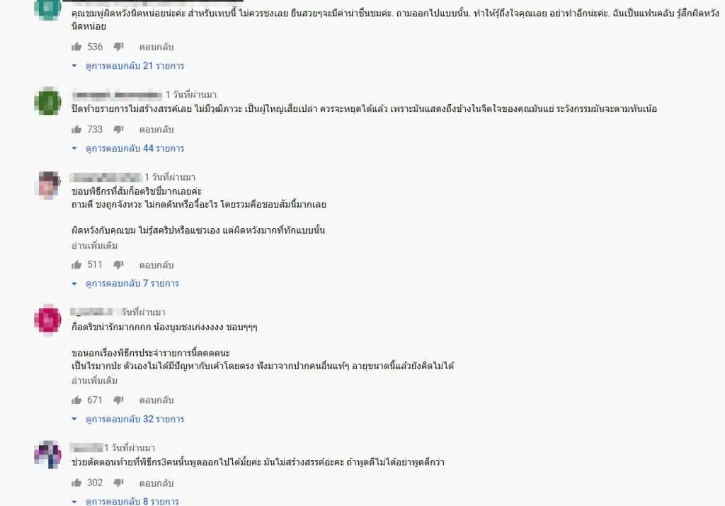 งานนี้ก็ทำเอาชาวเน็ตแห่เข้ามาคอมเมนต์วิพากษ์วิจารณ์พิธีกรอย่างมากมาย เช่น ปิดท้ายรายการไม่สร้างสรรค์เลย ไม่มีวุฒิภาวะ เป็นผู้ใหญ่เสียเปล่า ควรจะหยุดได้แล้ว เพราะมันแสดงถึงข้างในจิตใจของคุณมันแย่ ระวังกรรมมันจะตามทันเน้อ เเละ เกลียดตอนปิดรายการ ไม่ใช่ติ่งใครเลยนะ แต่มันไม่สมควรเลยทั้ง3คน ทำตัวหน้าเกลียด ดูออกหล่ะ…ท่าทางที่พวกเธอทำ ดูออก ถ้าเกลียดเขาจะเฉยๆไม่ยุ่งนะ แต่นี่ อิจฉาหนอหรืออะไร แซะ เขาแสดงอาการทั้ง3คน ห่วยแตก ดีนะที่ไม่เคยติดตาม ไม่งั้นคงเสียความรู้สึกมากกว่านี้