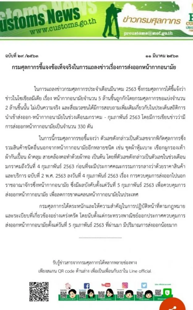 "ในการแถลงข่าวกรมศุลกากร ประจำเดือนมีนาคม 2563 ซึ่งกรมศุลกากรได้ชี้แจงว่า ข่าวในโซเชียลมีเดีย เรื่อง หน้ากากอนามัยจำนวน 5 ล้านชิ้นถูกกัก โดยกรมศุลกากรขอแบ่งจำนวน 2 ล้านชิ้นนั้น ไม่เป็นความจริง และสื่อมวลชนได้มีการสอบถามเพิ่มเติมเกี่ยวกับในประเด็นสถิติการนำเข้าส่งออก-หน้ากากอนามัยในช่วงเดือนมกราคม - กุมภาพันธ์ 2563 โดยมีการเขียนข่าวว่ามีการส่งออกหน้ากากอนามัยเป็นจำนวน 330 ตัน