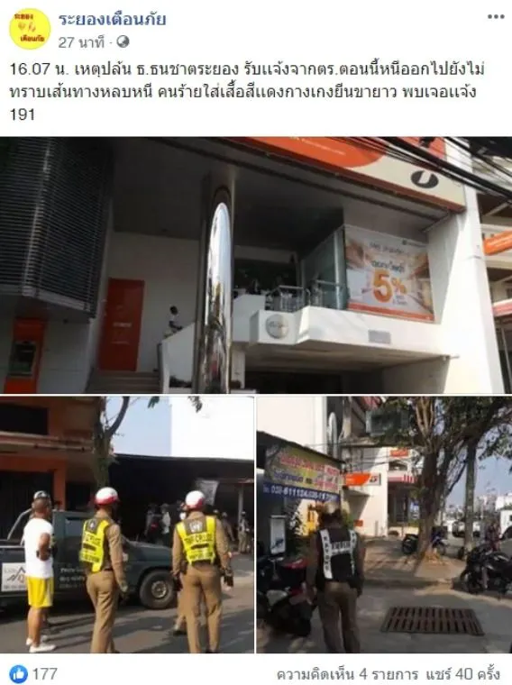 วันที่ 11 มีนาคม 63 เกิดเหตุคนร้ายบุกปล้นธนาคารธนชาติ สาขาระยอง บริเวณหน้าห้างเทสโก้โลตัส จากการสอบสวนทราบว่า คนร้ายใส่เสื้อสีแดง นุ่งกางเกงวอร์มสีเขียว ใช้อาวุธปืนข่มขู่เจ้าหน้าที่ให้ส่งเงินจำนวนกว่า 1 แสนบาทให้ โดยใช้อาวุธปืนยิงข่มขู่เพื่อเปิดทางหลบหนีลงด้านหลังของธนาคาร แล้ววิ่งไปทางริมถนนสุขุมวิท ขึ้นรถเก๋งโตโยต้า สีขาว ไม่ทราบหมายเลขทะเบียน ที่มีคนขับจอดรอไว้ ซึ่งยังไม่ทราบเส้นทางหลบหนี