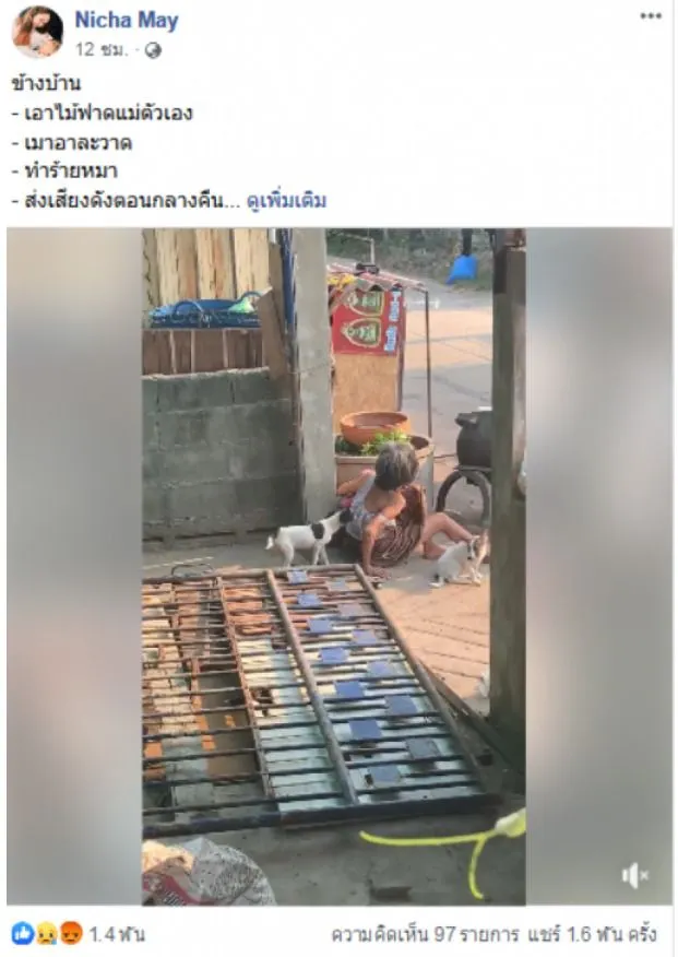 ข้างบ้าง เอาไม้ฟาดแม่ตัวเอง เมาอาละวาด ทำร้ายหมา ส่งเสียงดังตอนกลางคืน ที่ผ่านมาพยายามทำทุกอย่าง แจ้งความตามตำรวจ แจ้งศูนย์ดำรงธรรม แจ้งเทศบาล แจ้งสาธารณสุข
