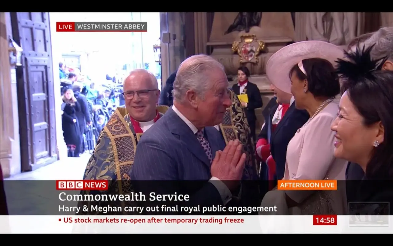 เมื่อวันที่ 9 มีนาคมที่ผ่านมา เจ้าฟ้าชายชาลส์ เจ้าชายแห่งเวลส์ เสด็จไปยังมหาวิหารเวสต์มินสเตอร์ เพื่อร่วมพิธีทางศาสนาเนื่องในวันเครือจักรภพ (Commonwealth Day) โดยการนี้พระองค์ทรงใช้วิธีการไหว้ (หรือการพนมมือ 'นมัสเต') แทนการสัมผัสพระหัตถ์ต่อคณะบุคคลที่รอต้อนรับ