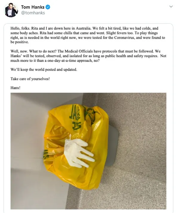 โดย Tom Hanks ทวีตข้อความว่า สวัสดี กับผมอยู่ที่ออสเตรเลีย เรารู้สึกเหนื่อยนิดหน่อย ร่างกายปวดเมื่อย ริต้าปวดเป็นเป็นไข้เยอะกว่า ไปตรวจว่าเป็น โควิด19 หรือไม่ ผลออกมาว่าเป็นบวก