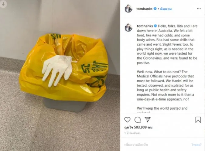 ผู้สื่อข่าวรายงานว่า ทอม แฮงก์ กับริต้า ภรรยา ติดไวรัสโควิด-19 เมื่อวันที่ 12 มีนาคม ทอม แฮงก์ ดาราฮอลลีวูดคนดัง อายุ 63 ปี ได้ทวีตในทวิตเตอร์ tomhanks บอกว่าตัวเองและริต้าภรรยาอายุ 63 ปี ติดโรคโควิด-19