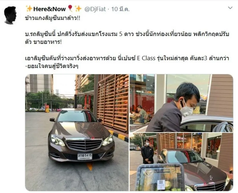 ข้าวแกงลิมูซีนมาล้าว บ.รถลิมูซีนนี้ ปกติวิ่งรับส่งแขกโรงแรม 5 ดาว ช่วงนี้นักท่องเที่ยวน้อย พลิกวิกฤตปรับตัว ขายอาหาร เอาลิมูซีนคันที่ว่างมาวิ่งส่งอาหารด้วย นี่เบนซ์ E Class รุ่นใหม่ล่าสุด คันละ3 ล้านกว่า ยอมใจคนสู้ชีวิตจริงๆ