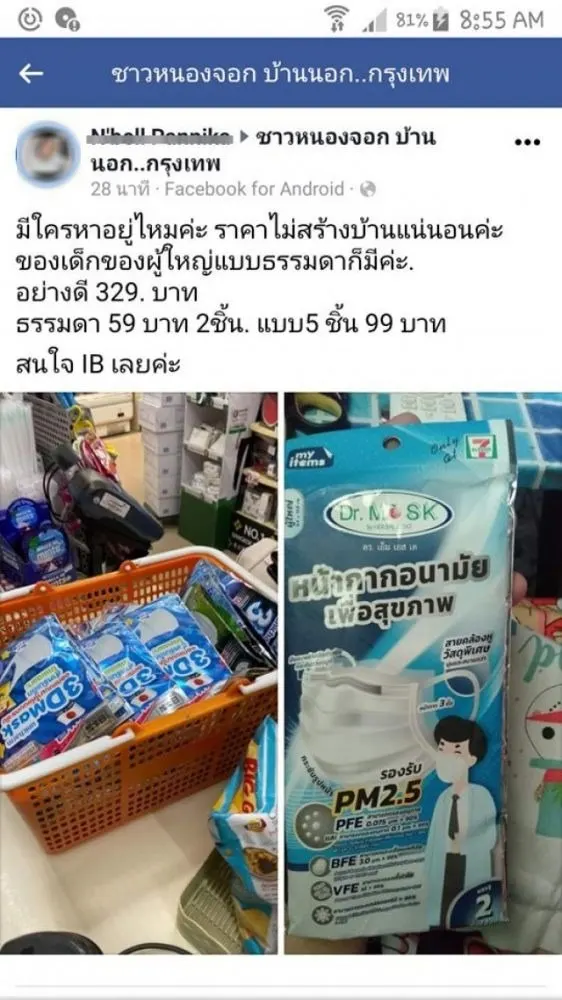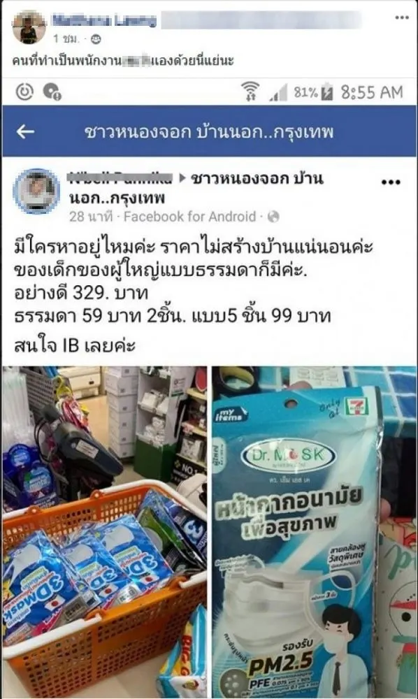 จากสถานการณ์ COVID ในปัจจุบัน ทำให้ประชาชนทั้งประเทศต่างหาซื้อหน้ากากอนามัยกันเป็นจำนวนมาก ซึ่งเหล่าบรรดาพ่อค้าแม่ค้าถือวิกฤตครั้งนี้กักตุนหน้ากากอนามัยกันเพื่อมาขายในราคาแพงกว่าหลายเท่าตัว ล่าสุดได้มีพนักงานร้านสะดวกซื้อชื่อดัง ได้กักตุนหน้ากากอนามัยที่ร้านสะดวกซื้อแห้งหนึ่ง โโยสาวคนดังกล่าวทำงานเป็นพนักงานอยู่ร้านนี้และได้นำไปโพสต์ขายในเฟซบุ๊ค ส่วนตัว โดยมีราคาตั้งแต่ 329 บาท 99 บาท และ 59 บาท เลยทีเดียว