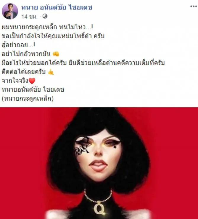 ล่าสุดทางด้าน ทนายชื่อดัง นายอนันต์ชัย ไชยเดช ได้ออกมาโพสต์ข้อความผ่านเพจของตนให้กำลังใจแหม่มโพธิ์ดำ