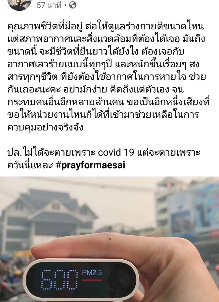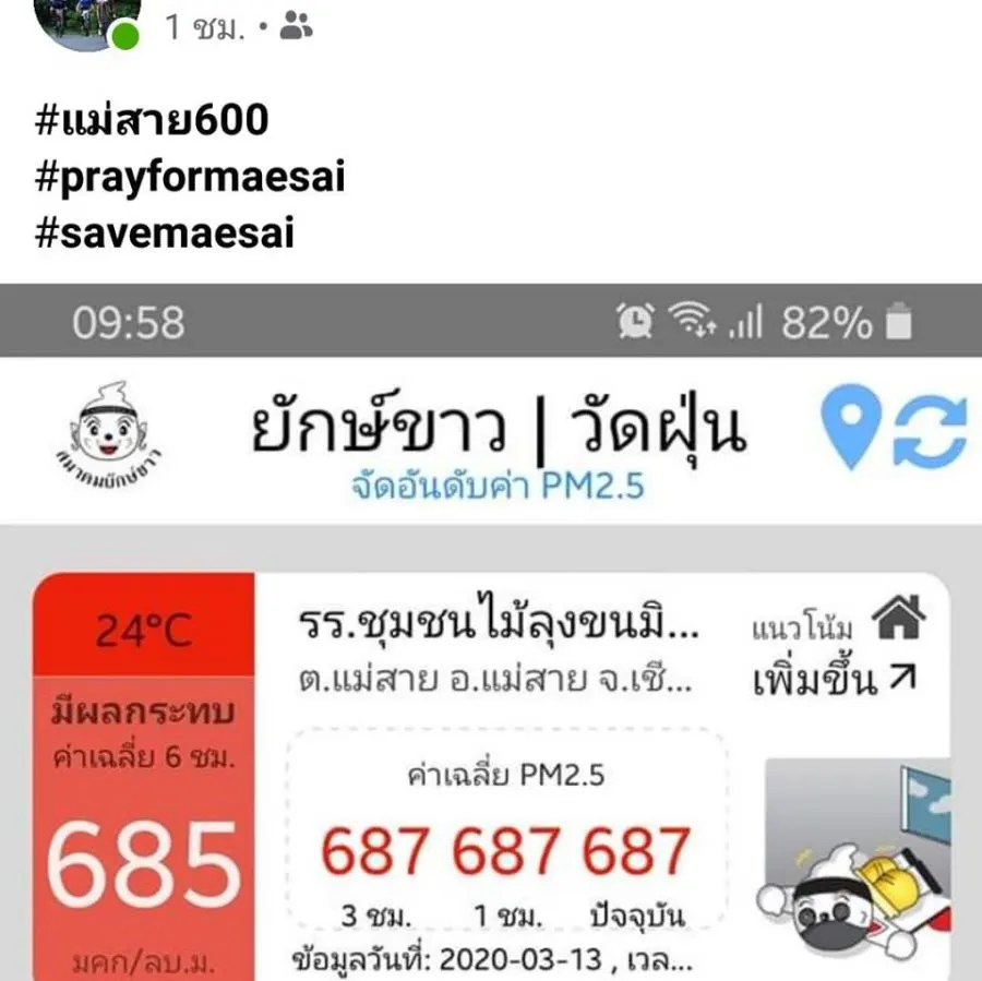 ประชาชนชาวแม่สายพร้อมใจติดแฮชแท็ก #PrayForMaesai #Maesai600 เรียกร้องให้มีการแก้ไขปัญหาหมอกควันข้ามแดนอย่างยั่งยืน หลังจากต้องเจอกับปัญหาฝุ่นควันเกินค่ามาตรฐานติดต่อกันวันนี้เป็นวันที่ 7 หลายคนมีอาการเกี่ยวกับทางเดินหายใจ เลือดออกจมูก ความดันโลหิตสูง