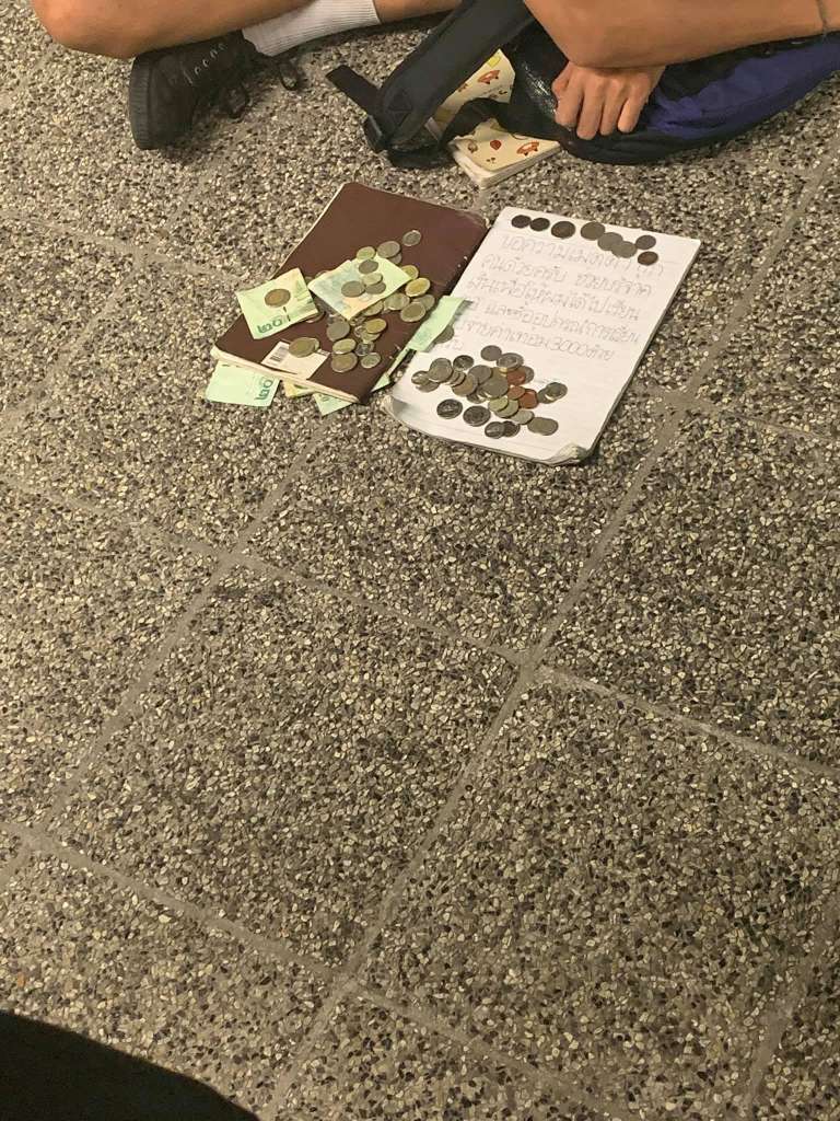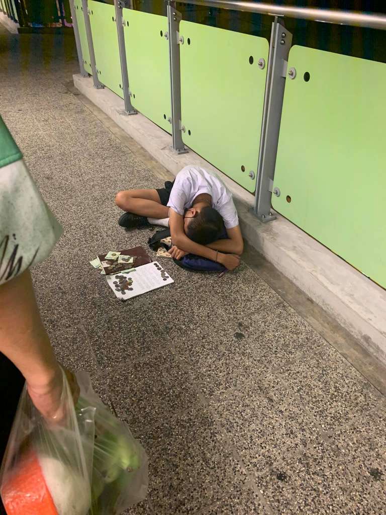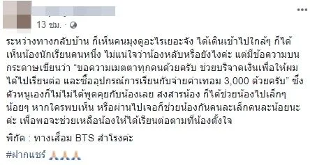 ระหว่างทางกลับบ้าน ก็เห็นคนมุงดูอะไรเยอะจัง ได้เดินเข้าไปใกล้ๆ ก็ได้เห็นน้องนักเรียนคนหนึ่ง ไม่แน่ใจว่าน้องหลับหรือยังไงค่ะ แต่มีข้อความบนกระดาษเขียนว่า “ขอความเมตตาทุกคนด้วยครับ ช่วยบริจาคเงินเพื่อให้ผมได้ไปเรียนต่อ และซื้ออุปกรณ์การเรียนกับจ่ายค่าเทอม 3,000 ด้วยครับ”