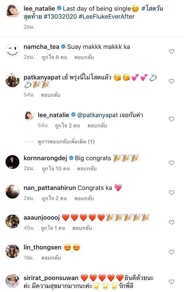 และล่าสุดวันพรุ่งนี้ก้เป้นวันที่ 14 มีนาคม 2563 ก็ถือว่าเป็นฤกษ์ดี ที่ ฟลุคและนาตาลี เลือกให้เป็นวันหมั้นและแต่ง ส่วนสถานที่ก็ได้เรียบร้อยแล้วเป็นโอเรียลเต็ลและเคมปินสกี้ ล่าสุดว่าที่เจ้าสาวของเราก็ได้โพสต์แคปชั่นเด็ดว่า “Last day of being single #โสดวันสุดท้าย #13032020 #LeeFlukeEverAfter”