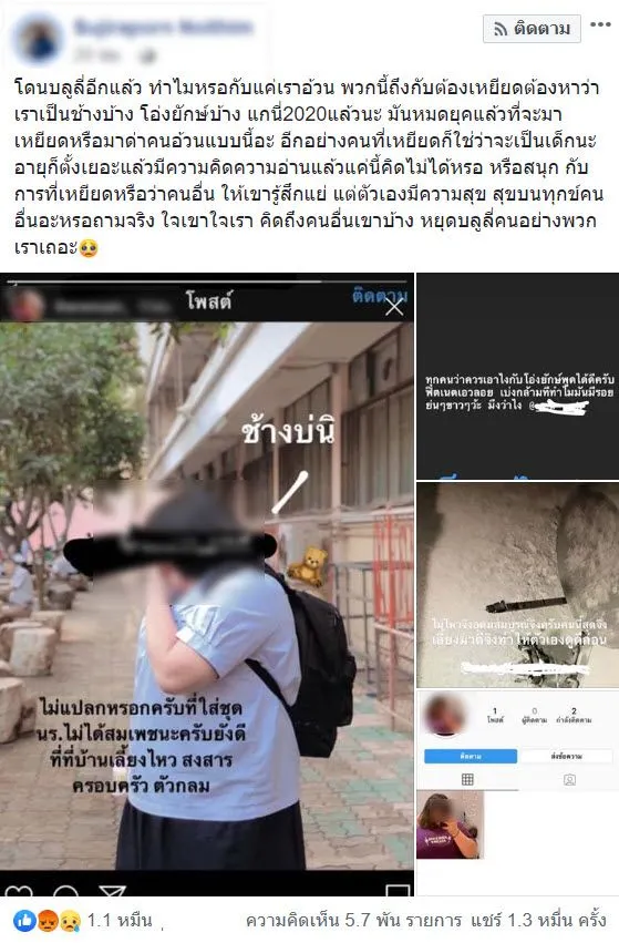 โดยผู้ใช้เฟซบุ๊คดังกล่าวได้โพสต์ข้อความระบุว่า “โดนบลูลี่อีกแล้ว ทำไมหรอกับแค่เราอ้วน พวกนี้ถึงกับต้องเหยียดต้องหาว่าเราเป็นช้างบ้าง โอ่งยักษ์บ้าง แกนี่2020แล้วนะ มันหมดยุคแล้วที่จะมาเหยียดหรือมาด่าคนอ้วนแบบนี้อะ อีกอย่างคนที่เหยียดก็ใช่ว่าจะเป็นเด็กนะ อายุก็ตั้งเยอะแล้วมีความคิดความอ่านแล้วแค่นี้คิดไม่ได้หรอ หรือสนุก กับการที่เหยียดหรือว่าคนอื่น ให้เขารู้สึกแย่ แต่ตัวเองมีความสุข สุขบนทุกข์คนอื่นอะหรอถามจริง ใจเขาใจเรา คิดถึงคนอื่นเขาบ้าง หยุดบลูลี่คนอย่างพวกเราเถอะ”