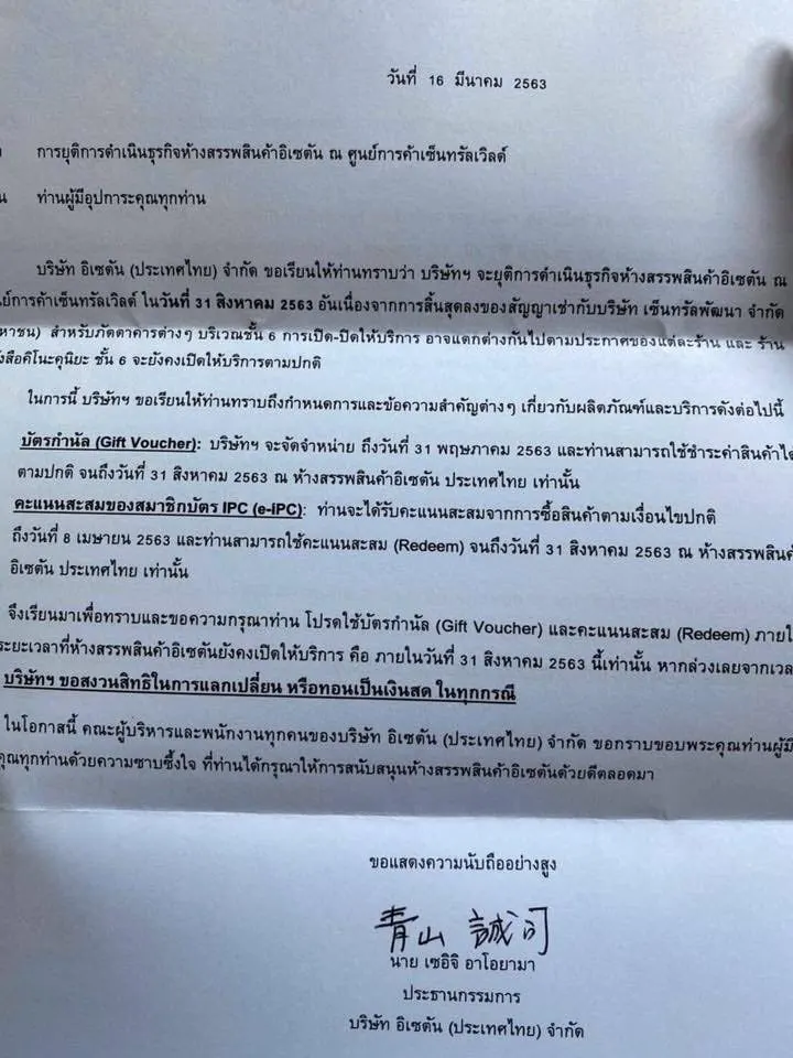 14 มี.ค. 2563 มีรายงานว่า นายเซอิจิ อาโอยามา ประธานกรรมการ ห้างสรรพสินค้าอิเซตัน ประเทศไทย ออกจดหมายประกาศ ระบุวันที่ 16 มีนาคม 2563 ถึงลูกค้าห้างสรรพสินค้าอิเซตันว่า จะยุติดำเนินกิจการ ณ ศูนย์การค้าเซ็นทรัลเวิลด์ (CTW) ในวันที่ 31 สิงหาคม 2563 นี้เป็นต้นไป