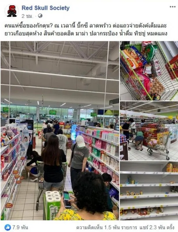 14 มีนาคม 2563 เพจ Red Skull Society ได้โพสต์ภาพพร้อมข้อความใจความว่า “คนแห่ซื้อของกักตุน ณ เวลานี้ บิ๊กซี ลาดพร้าว ต่อแถวจ่ายตังค์เต็มและยาวเกือบสุดห้าง สินค้ายอดฮิต มาม่า ปลากระป๋อง น้ำดื่ม ทิชชู่ หมดแผง”