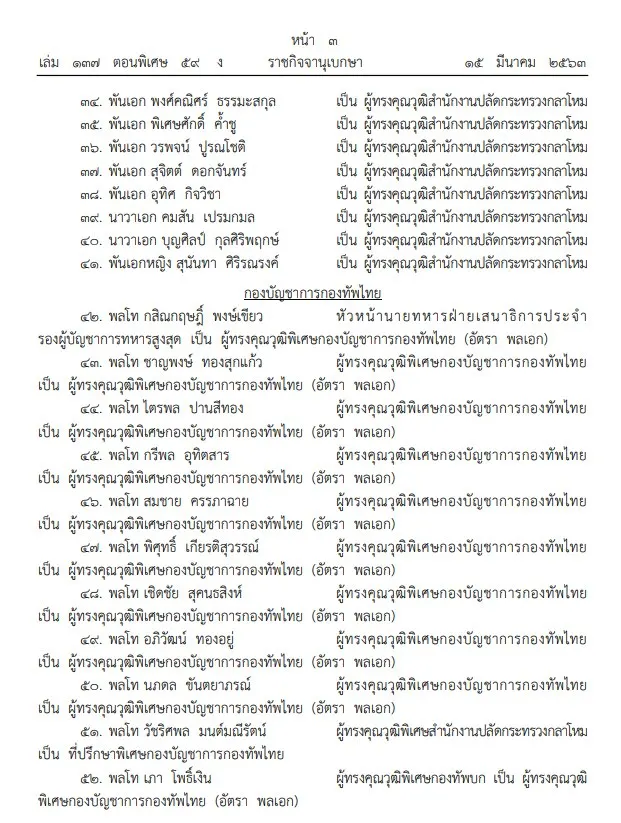 เมื่อวันที่ 15 มี.ค 2563 ผู้สื่อข่าวรายงานว่า เว็บไซต์ราชกิจจานุเษกษาเผยแพร่ประกาศ สำนักนายกรัฐมนตรี เรื่องให้นายทหารรับราชการ มีพระบรมราชโองการโปรดเกล้าโปรดกระหม่อมให้นายทหารรับราชการสนองพระเดชพระคุณ จำนวน 238 นายดังนี้
