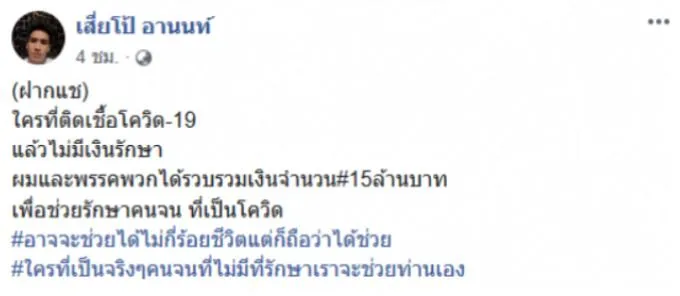 ล่าสุด เสี่ยโป้ อานนท์ ได้โพสต์ข้อความระบุว่า “ฝากแชร์ ใครที่ติดโควิด แล้วไม่มีเงินรักษา ผมและพรรคพวกได้รวบรวมเงินจำนวน 15ล้านบาท เพื่อช่วยรักษาคนจน ที่เป็นโควิด อาจจะช่วยได้ไม่กี่ร้อยชีวิตแต่ก็ถือว่าได้ช่วย ใครที่เป็นจริงๆคนจนที่ไม่มีที่รักษาเราจะช่วยท่านเอง”