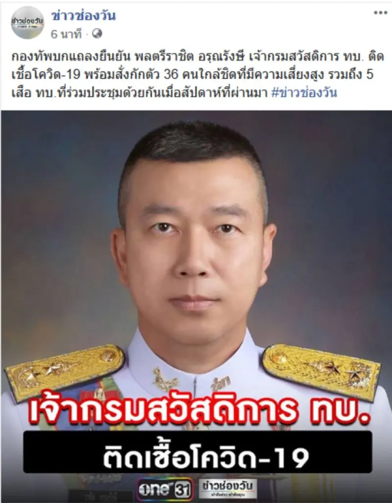 ล่าสุด เพจเฟซบุ๊ก ข่าวช่องวัน ได้โพสต์ โดยได้ระบุข้อความว่า กองทัพบกแถลงยืนยัน พลตรีราชิต อรุณรังษี เจ้ากรมสวัสดิการ ทบ ติด COVID พร้อมสั่งกักตัว 36 คนใกล้ชิด ที่มีความเสี่ยงสูง รวมถึง 5 เสือ ทบ ที่ร่วมประชุมด้วยกันเมื่อสัปดาห์ที่ผ่านมา