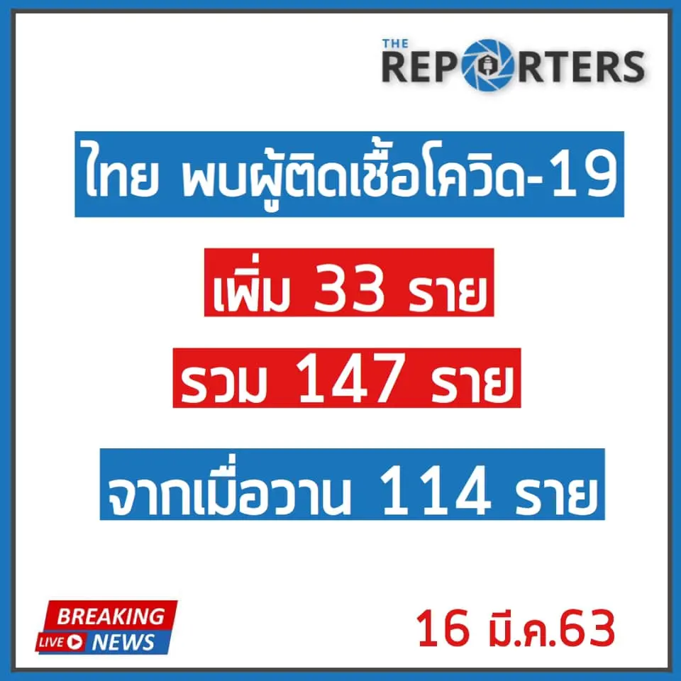 BREAKING:ไทย พบ ผู้ติดเชื้อ โควิด-19 เพิ่ม 33 ราย รวม 147 ราย เพิ่มขึ้นจากเมื่อวานที่มี 114 คน
