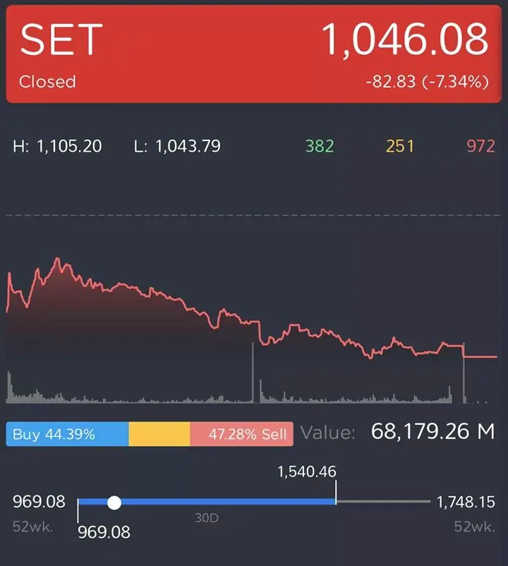 หุ้นไทยปิดตลาด 1,046.08 จุด ลดลง 82.83 จุด