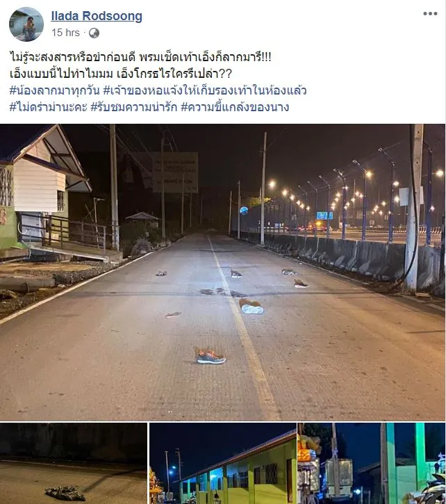 ซึ่งภาพที่ได้โพสต์ก็จะเห็นได้ว่า ทั้งรองเท้า พรมเช็ดเท้าของเเต่ละห้องเช้า กระจัดกระจายออกมาที่พื้นถนนเต็มไปหมด ตามเก็บทุกวันจนเหน็ดเหนื่อยไม่ไหวเเล้ว บางชิ้นก็พังเสียหาย ไม่รู้มันไปโกรธอะไรใครมา