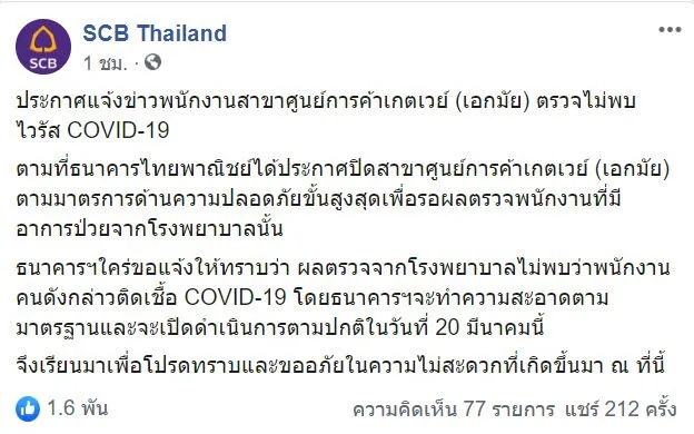 ล่าสุดเพจ "SCB Thailand"โพสต์ข้อความระบุว่า.. ประกาศแจ้งข่าวพนักงานสาขาศูนย์การค้าเกตเวย์ (เอกมัย) ตรวจไม่พบไวรัส COVID-19