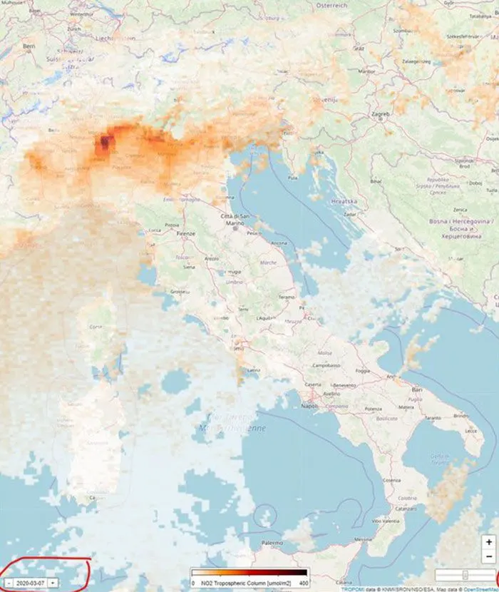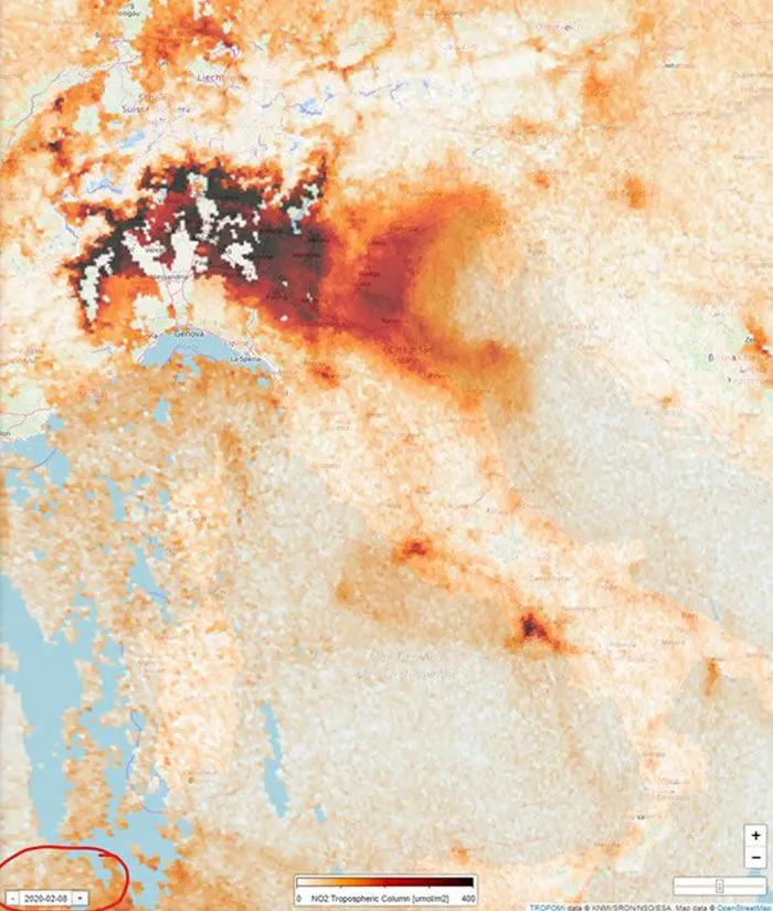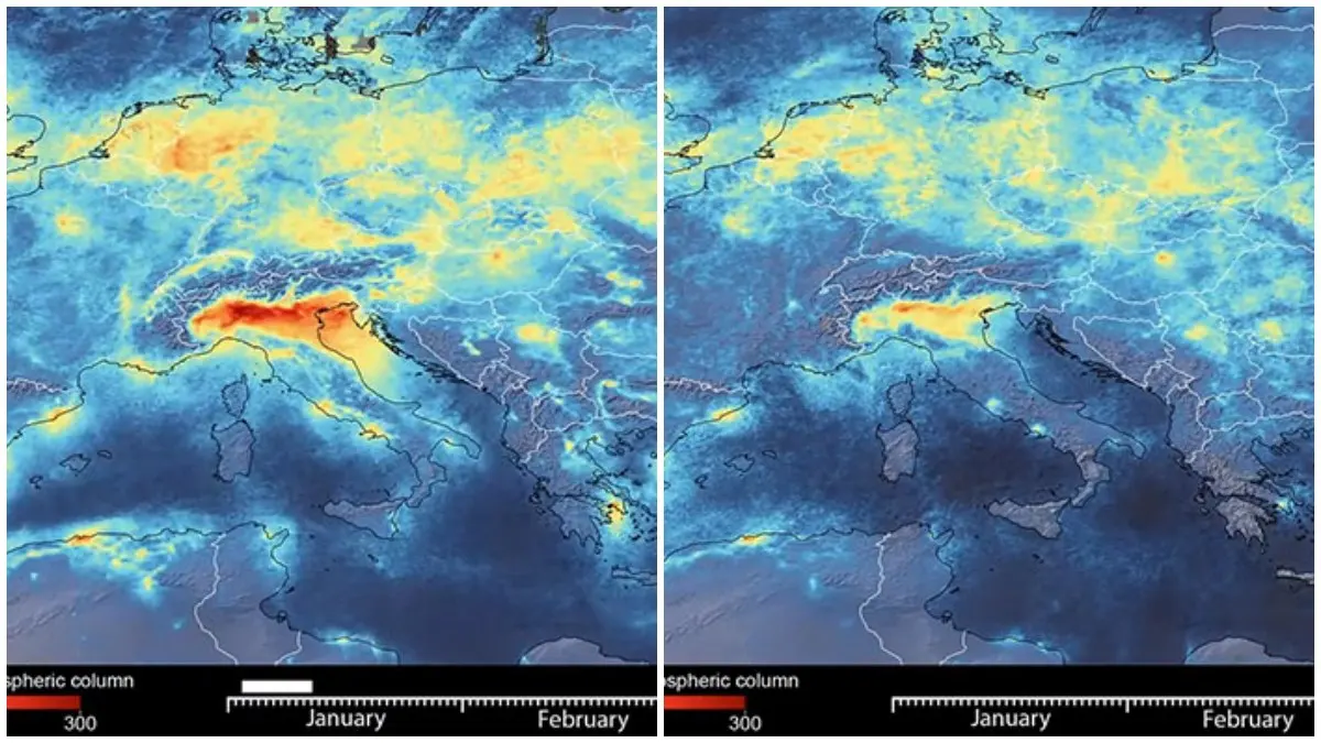 อ้างอิงจากองค์การอวกาศยุโรป (ESA) และนักวิจัยอิสระจำนวนหนึ่งตรวจสอบ การปล่อยก๊าซไนโตรเจนไดออกไซด์ ปรากฏว่าลดลงอย่างมาก ทั่วอิตาลีหลังจากมีการกักกันและปิดประเทศ หลังเกิดจากการแพร่กระจายของ COVID-19 อย่างรวดเร็ว