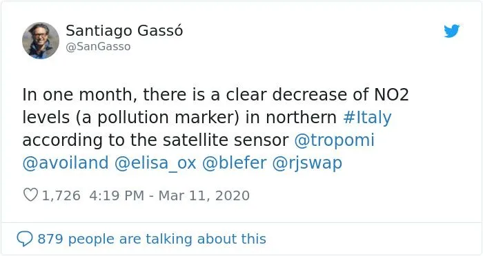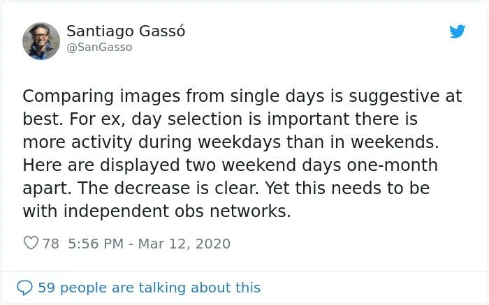 Santiago Gassóผู้ร่วมงานวิจัยของ NASA นำตัว Twitter ไปรายงานผลของเซ็นเซอร์ดาวเทียม นอกจากนี้เขายังอธิบายว่าในขณะที่การปล่อย NO2 ที่ผันผวนนั้นเป็นเรื่องปกติโดยสมบูรณ์เมื่อพิจารณาว่าแตกต่างกันภายใต้ปัจจัยต่าง ๆ เช่นวันในสัปดาห์การเปลี่ยนแปลงที่สังเกตได้นี้มีความสำคัญอย่างแน่นอน