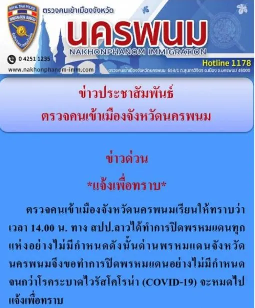 ต่อมาวันเดียวกัน ตรวจคนเข้าเมืองจังหวัดนครพนม แจ้งข่าวประชาสัมพันธ์ในเพจว่า ตรวจคนเข้าเมืองจังหวัดนครพนม เรียนให้ทราบว่า เวลา 14 00 น วันนี้ 17 มี ค ทาง สปป ลาว ปิดพรมแดนทุกแห่งอย่างไม่มีกำหนด ดังนั้น ด่านพรมแดนจังหวัดนครพนม จึงขอปิดพรมแดนอย่างไม่มีกำหนด จนกว่าCOVID -19 จะหมดไป จึงแจ้งเพื่อทราบ