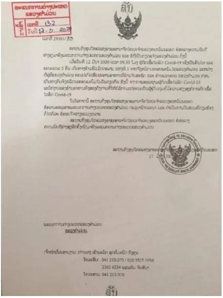 โดยเนื้อหาได้ระบุว่า เมื่อวันที่ 12 มี ค 2020 เวลา 09 30 น CD-19 เขาเป็นคนไทยและคณะรวม 5 คน เดินทางมาผ่านสะพานมิตรภาพไทย ลาว แห่งที่ 3 จากเมืองนครพนม ไปแขวงคำม่วน ระหว่างที่อยู่แขวงคำม่วน คณะได้รับประทานอาหารที่ร้านจันสถิตและร้านอาหารพรเทพ แขวงคำม่วน ก่อนพนักงานของร้านอาหารทั้งสองแห่งดังกล่าว ที่ให้บริการแขกคณะผู้อยู่ในกลุ่มที่มีความเสี่ยงสูงอาจติด CD-19