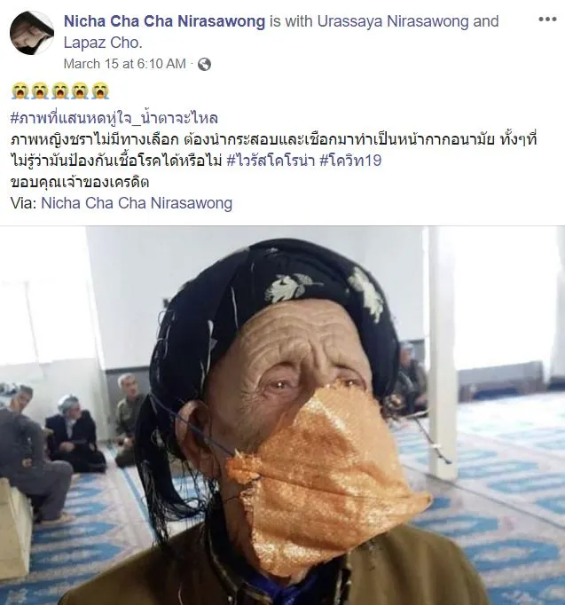 โดยทางผู้ใช้เฟซบุ๊ค Nicha Cha Cha Nirasawong ได้เผยภาพที่ได้ดูเเล้วเป็นต้องจุกอก เป็นภาพที่แสนหดหู่ใจ น้ำตาจะไหลหญิงชราไม่มีทางเลือก ต้องนำกระสอบและเชือกมาทำเป็นหน้ากากอนามัย ทั้งๆที่ไม่รู้ว่ามันป้องกันเชื้อโรคได้หรือไม่ ไวรัสโคโรน่า โควิด-19 ขอบคุณเจ้าของเครดิต ถึงเเม้ว่าจะไม่ใช่ในประเทศไทย เเต่ก็อดสงสารเวทนายายคนดังกล่าวไม่ได้จริงๆ อยู่มาจนอายุปูนนี้ ต้องมาเจอวิกฤตครั้งใหญ่ของโรคติดต่ออันร้ายเเรงโควิด-19