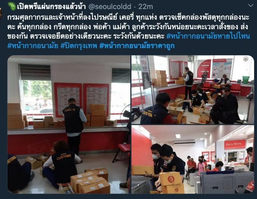โดยมีการเผยว่า กรมศุลกากรเเละเจ้าหน้าที่ลงไปรษณีย์ เคอรี่ทุกเเห่ง ตรวจเช็คกล่องพัสดุทุกกล่อง ค้นทุกกล่อง กรีดทุกกล่อง พ่อค้าเเม่ค้า รวมทั้งลูกค้าระวังกันหน่อยนะ เวลาสั่งของ ส่งของกัน ตรวจเจอยึดอย่างเดียวเลย ระวังกันด้วย