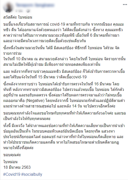 ซึ่งหลังจากทราบข่าว ใบหม่อนได้เข้ารับการตรวจในวันที่ 16 มีนาคม โดยทันที หลังจากทราบข่าวมิสเตอร์ป๋อง ไปตรวจแล้วพบเชื้อ ใบหม่อน ได้กักตัวอยู่ที่บ้าน และรอรับผลตรวจ ซึ่งต่อมาได้รับผลการตรวจมา แล้วว่าไม่พบเชื้อ ผลออกมาคือ (Negative) โดยหลังจากนี้ ใบหม่อนจะกักตัวและปฏิบัติตามคำแนะนำทางด้านสาธารณสุขต่อไป และหลัง 14 วัน จะไปตรวจอีกครั้งค่ะ ขอบคุณทุกกำลังใจและขอโทษกับทุกคน ที่ทำให้เกิดความกังวลใจค่ะ และขอเป็นกำลังใจให้กับทุกคนนะคะทั้งนี้ มีเพจ… ได้นำภาพและข้อความที่ทำให้เกิดความเสียหายเป็นการนำเข้าข้อมูลอันเป็นเท็จ ในระบบคอมพิวเตอร์อันบิดเบือน โดยทุจริต แสวงหาประโยชน์เรียกยอดไลค์ ยอดแชร์ กล่าวหาที่ทำให้ใบหม่อนเกิดเสียหาย และทำให้ประชาชนเกิดความแตกตื่น หากไม่โพสขอโทษจะดำเนินคดีตามกฏหมายให้ถึงที่สุดค่ะ ขอบคุณค่ะ ใบหม่อน 18 มีนาคม 2563