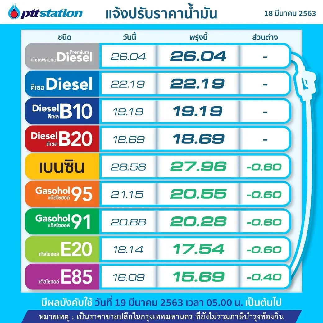บมจ.ปตท.น้ำมัน และการค้าปลีก (PTTOR) ในกลุ่มบมจ.ปตท. (PTT) และ บมจ.บางจาก คอร์ปอเรชั่น (BCP) ได้ประกาศปรับลดราคาน้ำมันทุกชนิดลง 60สต./ลิตร เว้น E85 ลง 40 สต./ลิตร ส่วนดีเซลคงเดิม ให้มีผลตั้งแต่เวลา 05.00 น. ของวันที่ 19 มี.ค.เป็นต้นไป ทั้งนี้การปรับลดราคาน้ำมันลงดังกล่าวส่งผลทำให้ ราคาน้ำมันในพื้นที่กรุงเทพฯ และปริมณฑล เป็นดังนี้
