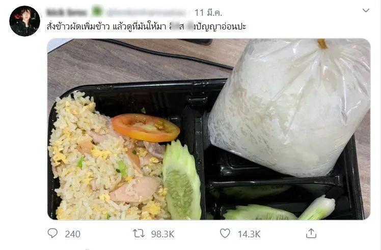 ผู้ใช้ทวิตเตอร์รายหนึ่ง สั่งข้าวผัดเพิ่มข้าว แต่แม่ค้าก็ดันแยกข้าวเพิ่มมาอีกถุง งานนี้ทำเอางงกันไปหมด ไม่รู้ว่าคนสั่งผิดหรือคนขายเข้าใจผิด